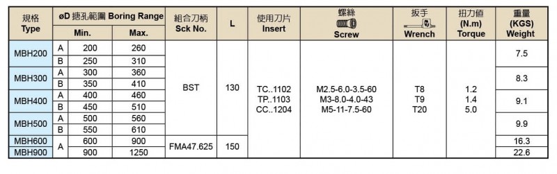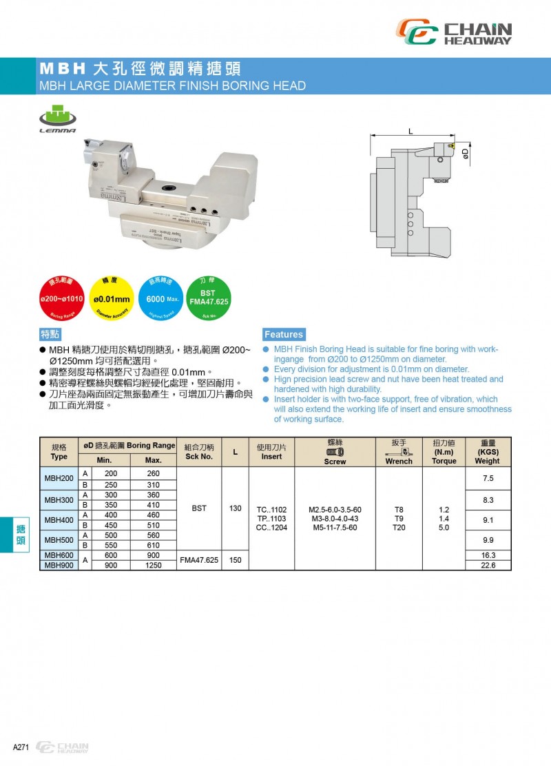 | ● MBH精搪刀使用於精切削搪孔。搪孔範圍ψ200~1250mm 均可搭配選用。 ● 調整刻度每格調整尺寸為直徑0.01mm。 ● 精密導程螺絲與螺帽均經硬化處理,堅固耐用。 ● 內藏式水孔,易於排屑與冷卻。 ● 刀片作為兩面固定無震動產生,可增加刀片壽命與加工面光滑度。 |
