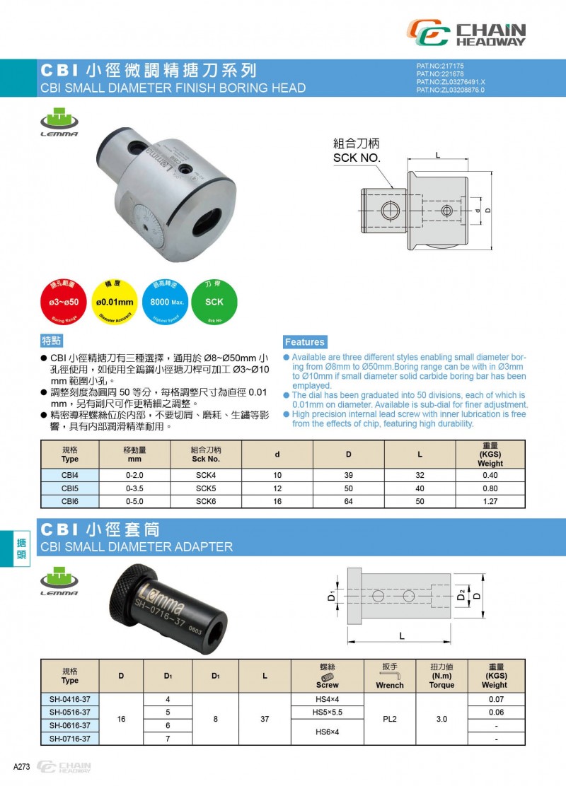 | ● CBI小徑精搪刀有三種選擇,通用於ψ8~ψ50mm小孔徑使用,如使用全鎢鋼小徑搪刀桿可加工ψ2~ψ10mm範圍小孔。 ● 調整刻度為圓周50等分,每格調整尺寸為直徑0.01mm,另有副尺可做更精細的調整。 ● 精密導程螺絲與螺帽均經硬化處理,堅固耐用。 |