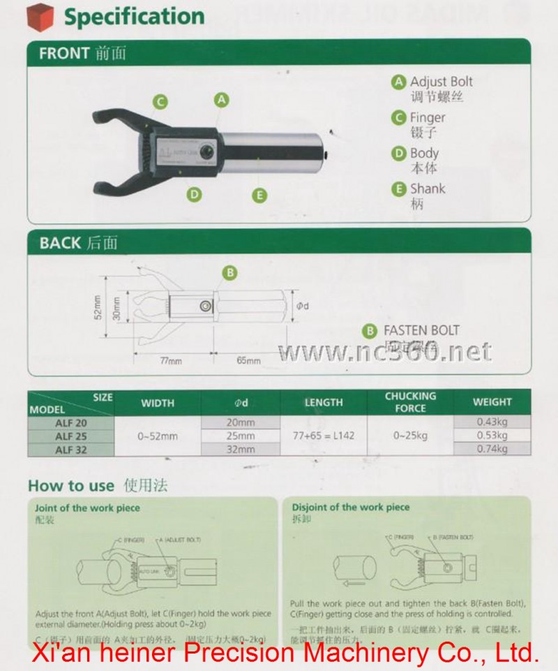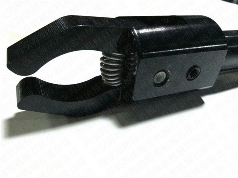 拉料器适用于数控车床及其他自动车床,装在拖板刀架上,拉棒料,不需工人上下料,可实现多次循环加工,提高数控车床的自动化程度,一个工人可以看多台数控车床。工作时,移动Z向拖板,将夹爪夹住棒料,松开卡盘或夹头,拖板走一个送料长度,夹紧卡盘或夹头,移开Z向拖板,就可以车削了。棒料较长时,主轴后端需做托架或料管。拉料器对中心,车一段比需送料棒料芯棒,夹在卡盘或夹头上,调整拉料器的两个爪子刚好都靠上芯棒,锁紧螺钉,就可以了。夹紧力大小通过增减碟簧来调整。