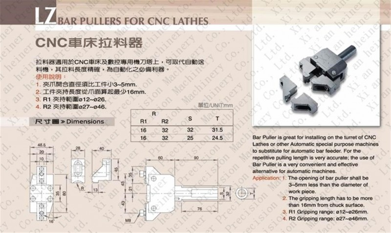 拉料器适用于数控车床及其他自动车床,装在拖板刀架上,拉棒料,不需工人上下料,可实现多次循环加工,提高数控车床的自动化程度,一个工人可以看多台数控车床。工作时,移动Z向拖板,将夹爪夹住棒料,松开卡盘或夹头,拖板走一个送料长度,夹紧卡盘或夹头,移开Z向拖板,就可以车削了。棒料较长时,主轴后端需做托架或料管。拉料器对中心,车一段比需送料棒料芯棒,夹在卡盘或夹头上,调整拉料器的两个爪子刚好都靠上芯棒,锁紧螺钉,就可以了。夹紧力大小通过增减碟簧来调整。