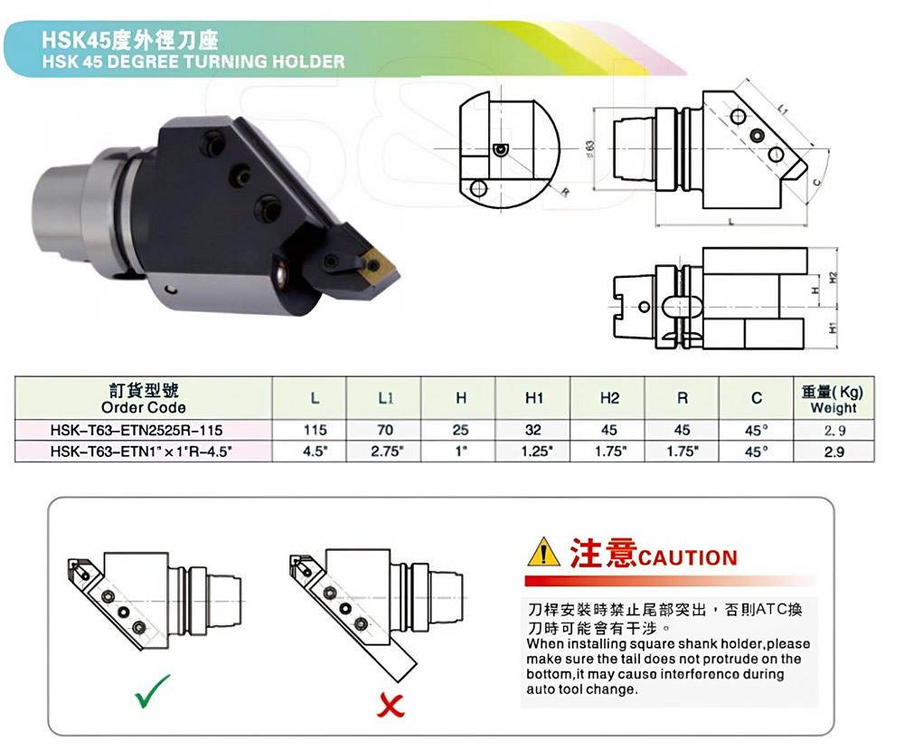 HSK-T63-ETN2525R-115外径刀座45度外圆刀座