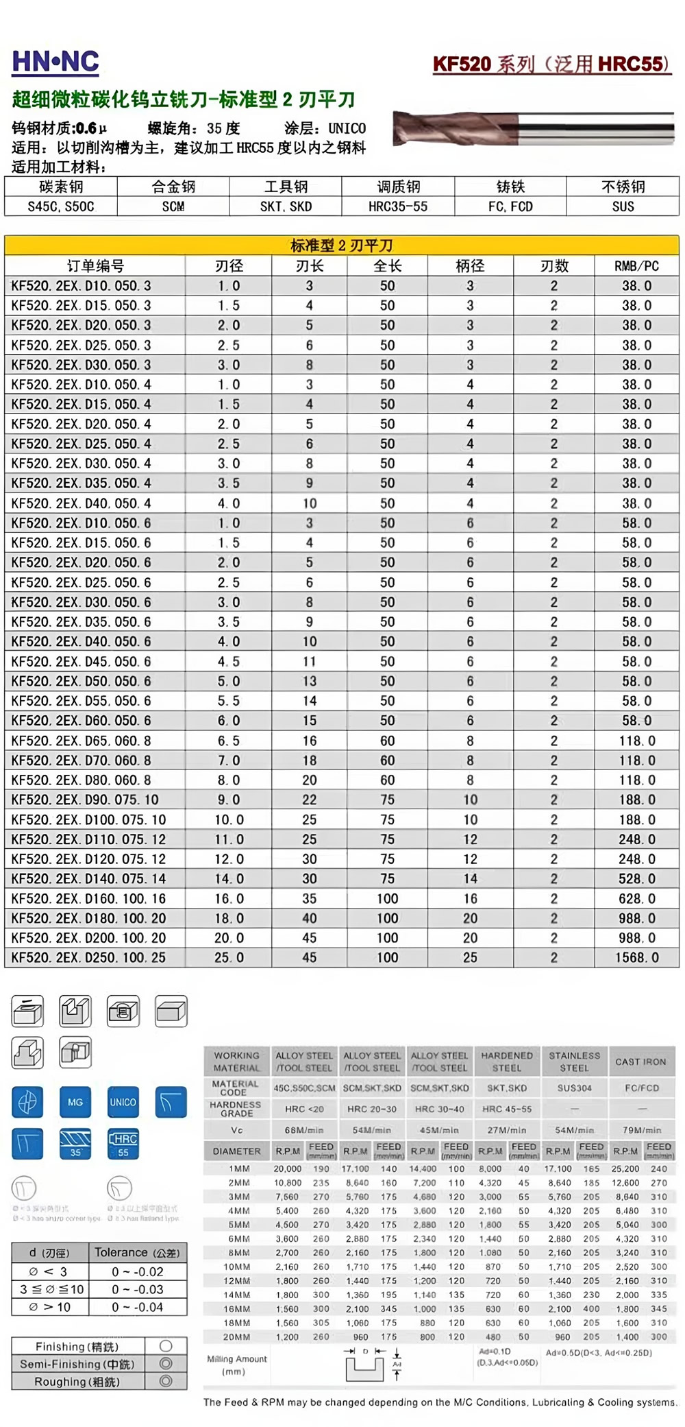 KF520泛硬2刃超微粒钨钢立铣刀合金立铣刀