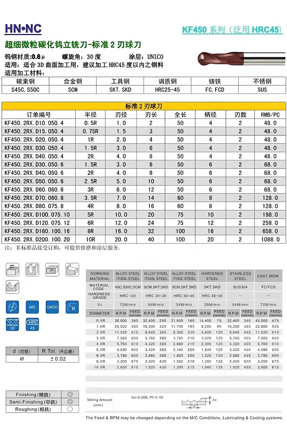 KF450泛用2刃超微粒钨钢球头铣刀R球型硬质合金涂层铣刀