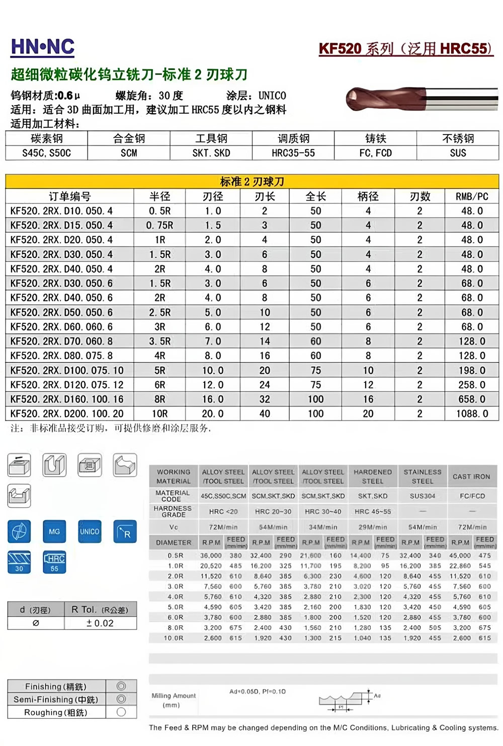 KF520泛硬2刃超微粒钨钢球头铣刀R球型合金高速涂层铣刀