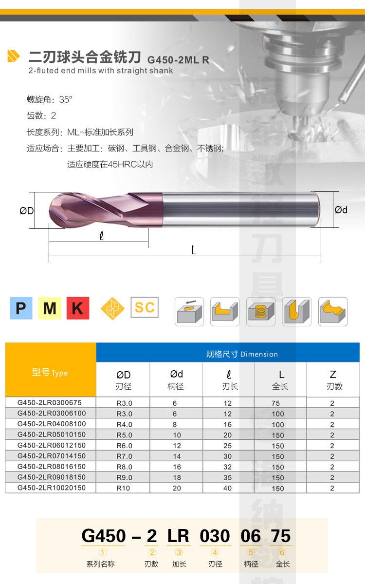G450加长球头铣刀R球形铣刀合金涂层2刃铣刀