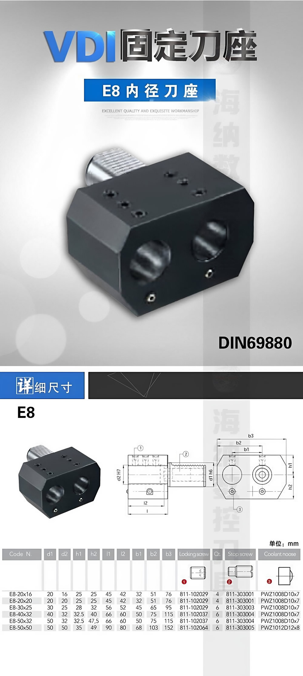 VDI E8左侧双孔内径刀座DIN69880多工位车刀座