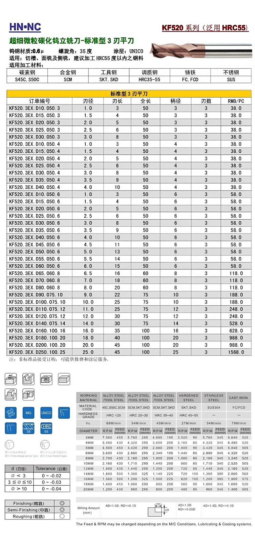 KF520泛硬3刃超微粒钨钢立铣刀高硬度高速涂层合金立铣刀
