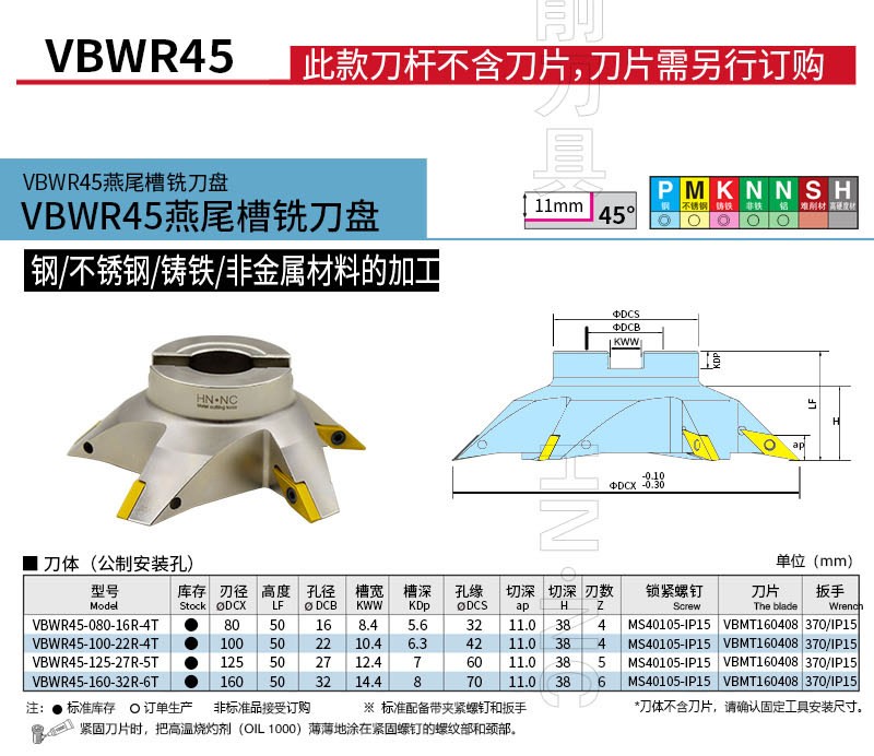 VBWR45-100-22-4T 45度加工中心数控燕尾槽平面清根铣刀盘
