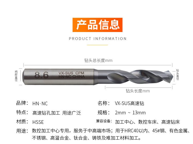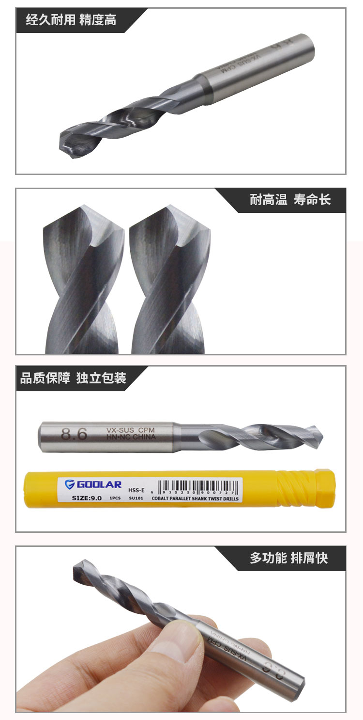 VX-SUS高速钢直柄麻花钻头不锈钢钛合金镍基合金高硬度材料专用钻头