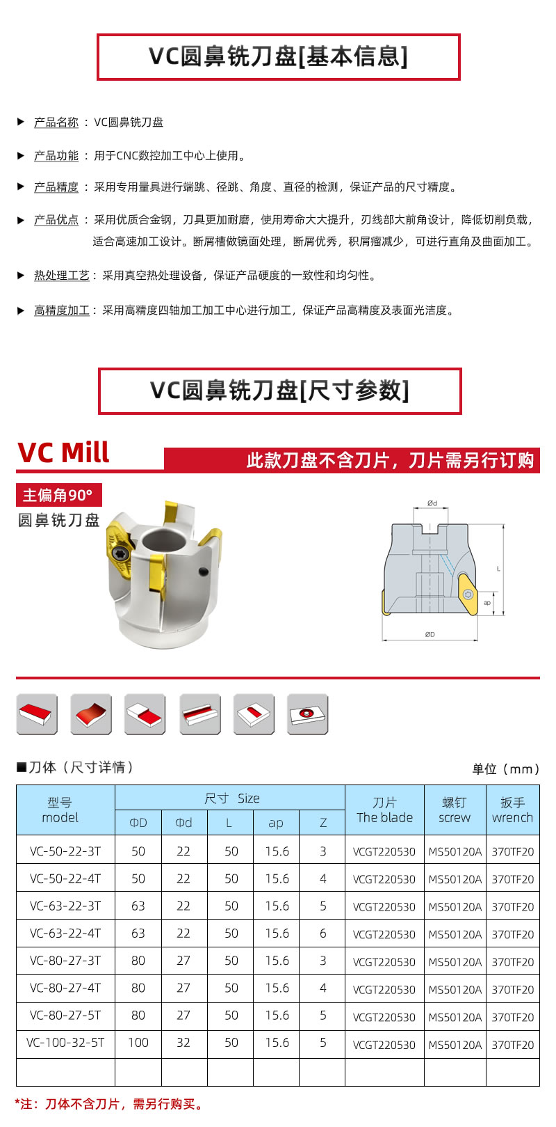 VC-C25-32-200铣刀盘快进给铣刀R3圆鼻铣刀仿形放肩斜坡加工
