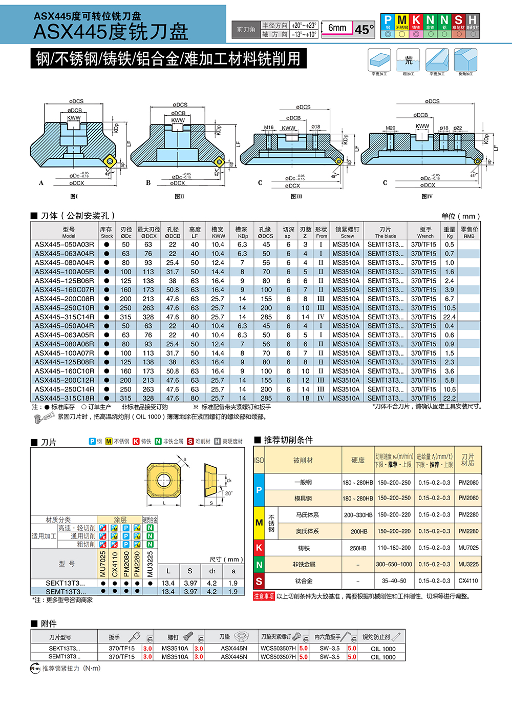 ASX445度可转位数控铣刀盘使用SEKT13T3/SEMT13T3铣刀片